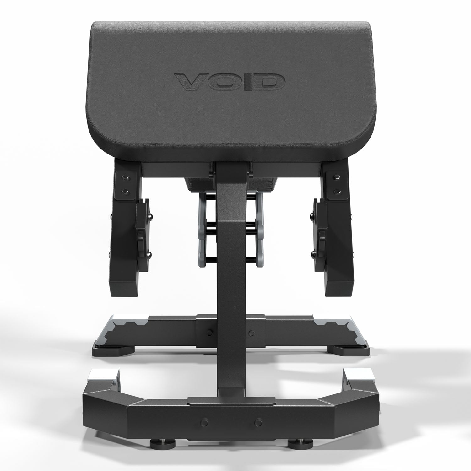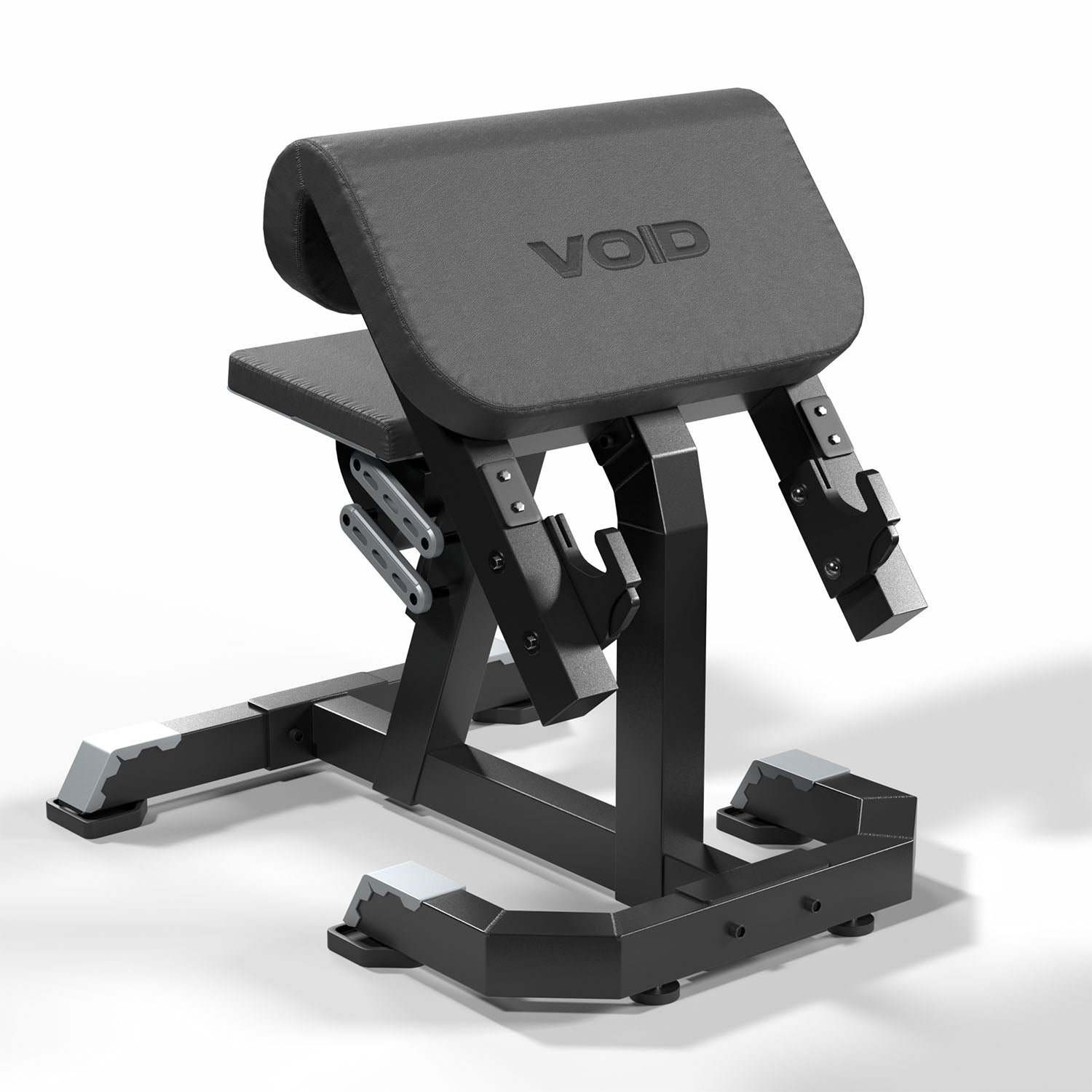 La estructura está construida con tubos de acero de alta resistencia con espesor de 25 mm, preparada para soportar uso continuo en entornos de alto tráfico. El diseño mantiene la estética característica de la línea VOID Performance, con estructura completamente negra y tapizado negro, entregando una apariencia sólida, moderna y profesional dentro de cualquier área de entrenamiento de brazos.