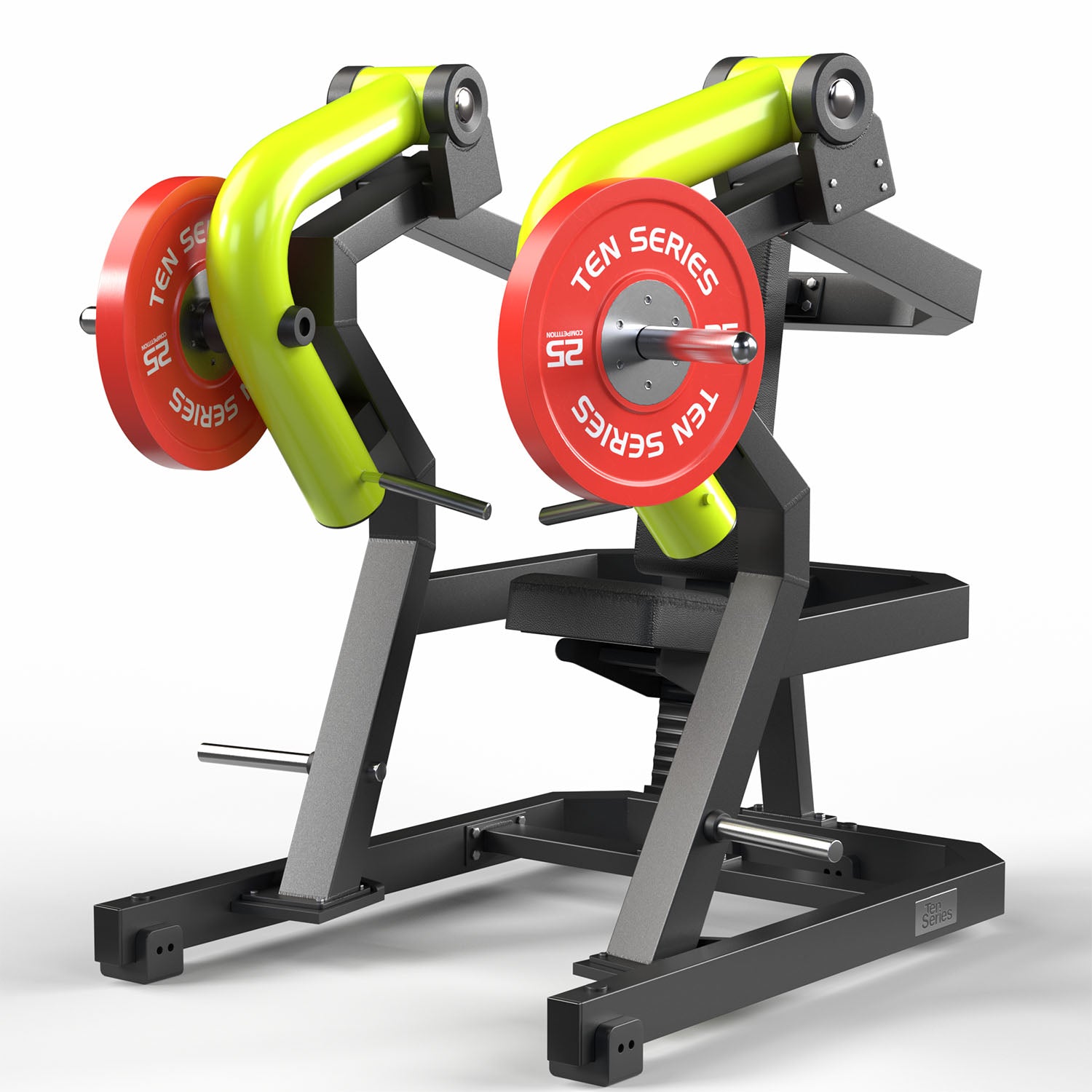 Los brazos de empuje redondos con tubo de 25 mm de espesor garantizan una gran durabilidad incluso bajo cargas elevadas, mientras que su diseño ergonómico permite una posición cómoda y segura para el usuario durante el ejercicio. La máquina incorpora soportes para discos olímpicos, permitiendo ajustar la carga de forma progresiva según el nivel del atleta.