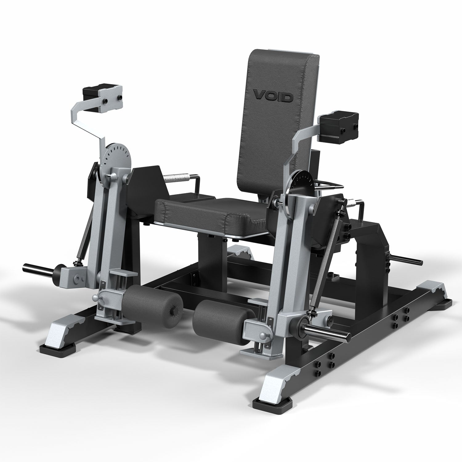 Su estructura está fabricada con tubos de acero de alta resistencia con espesor de 25 mm, diseñada para soportar uso continuo en entornos de alto tráfico. El diseño mantiene la estética robusta de la línea VOID Performance, combinando estructura negra con brazos en color gris y tapizado negro, logrando una apariencia moderna y profesional dentro de cualquier área de entrenamiento de piernas.