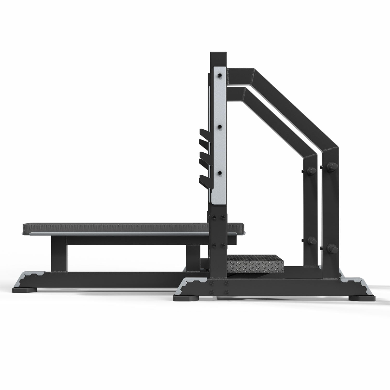El equipo cuenta con una banca acolchada ergonómica de alta densidad, diseñada para proporcionar comodidad y estabilidad durante el ejercicio. También incorpora una plataforma antideslizante para asistencia del spotter, permitiendo al entrenador o compañero ayudar al levantamiento con mayor seguridad.