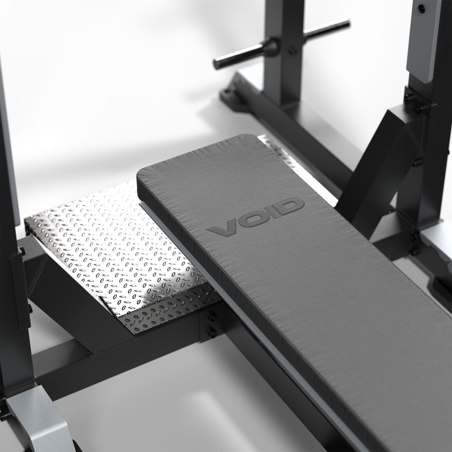 La estructura está fabricada con tubos de acero de alta resistencia con espesor de 25 mm, diseñada para soportar uso continuo en entornos de alto tráfico. Su diseño mantiene la estética característica de la línea VOID Performance, con estructura completamente negra y tapizado negro, entregando una apariencia sólida, moderna y profesional dentro de cualquier zona de entrenamiento de fuerza.