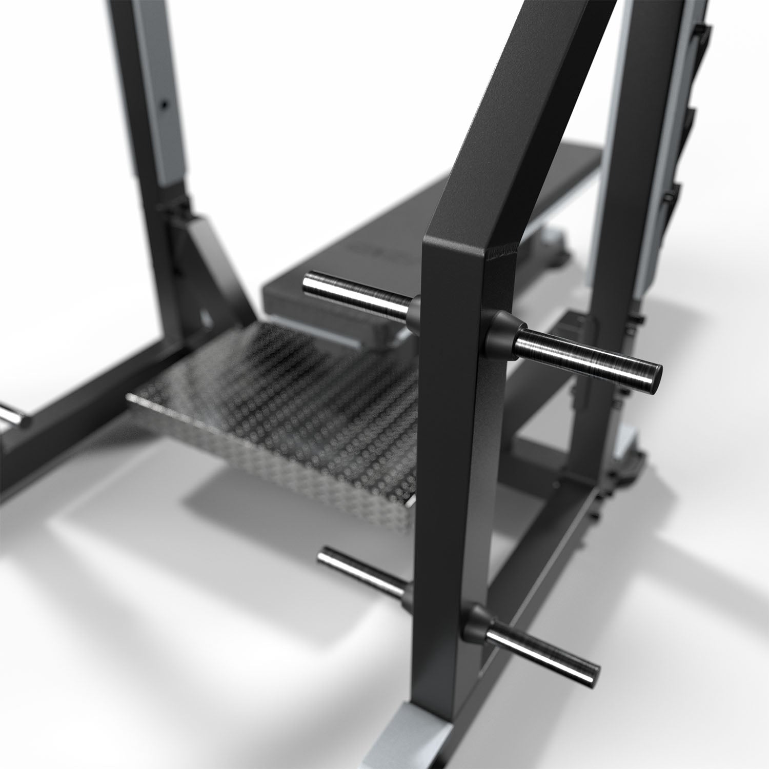 La estructura incorpora soportes de barra olímpica reforzados con múltiples posiciones, lo que permite ajustar la altura de salida de la barra según la estatura del usuario y mejorar la seguridad durante el levantamiento. Además, incluye soportes laterales para almacenamiento de discos olímpicos, facilitando la organización del área de entrenamiento y el acceso rápido a los pesos.