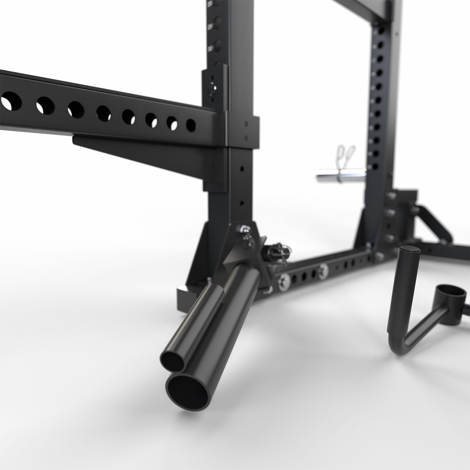 El rack es altamente configurable y compatible con más de 20 accesorios opcionales, incluyendo barras de dominadas, J-hooks, sistemas de seguridad, monolift, dip bars, core trainer y estaciones de lat pulldown, lo que permite transformar el rack en una estación completa de entrenamiento de fuerza dentro del gimnasio.