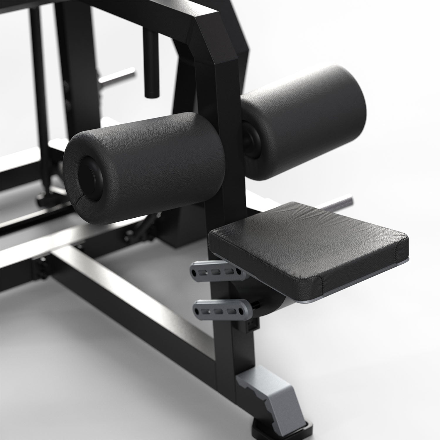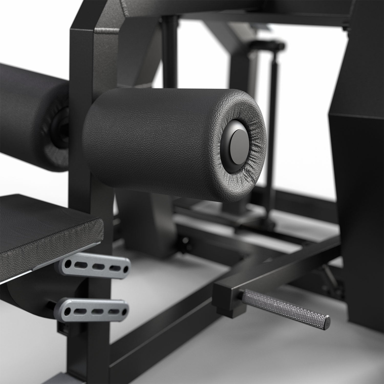 Para mayor estabilidad durante el ejercicio, incorpora rodillos de sujeción para las piernas de alta densidad, que permiten mantener el cuerpo fijo incluso cuando se trabaja con cargas elevadas. El asiento ergonómico ajustable y el acolchado profesional garantizan comodidad y soporte adecuado durante el entrenamiento.