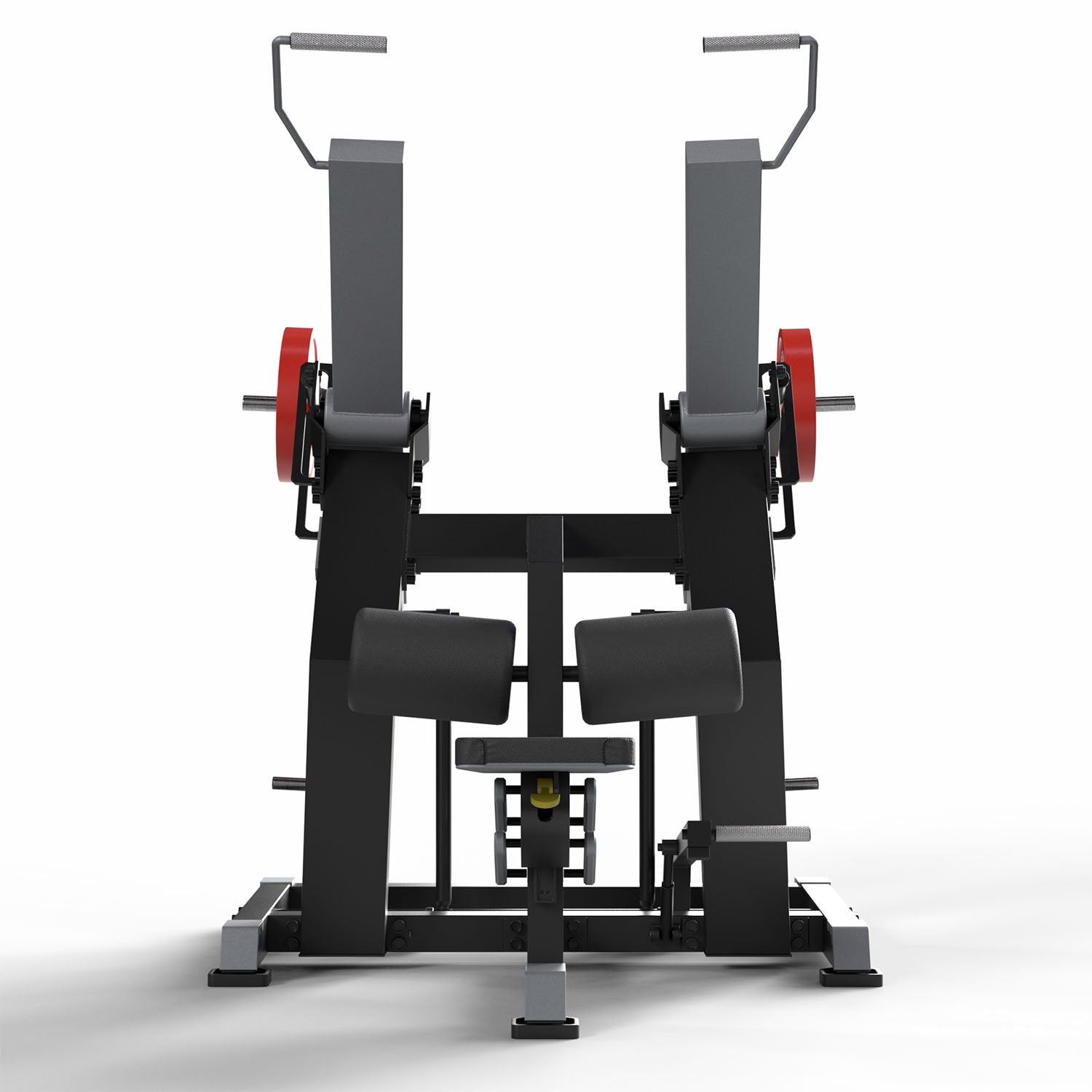 La máquina funciona bajo un sistema plate-loaded compatible con discos olímpicos, permitiendo ajustar la carga de manera simple y progresiva según el nivel del usuario. Su arquitectura mecánica optimiza la curva de resistencia durante todo el rango de movimiento, logrando una contracción muscular más efectiva y un entrenamiento más controlado.