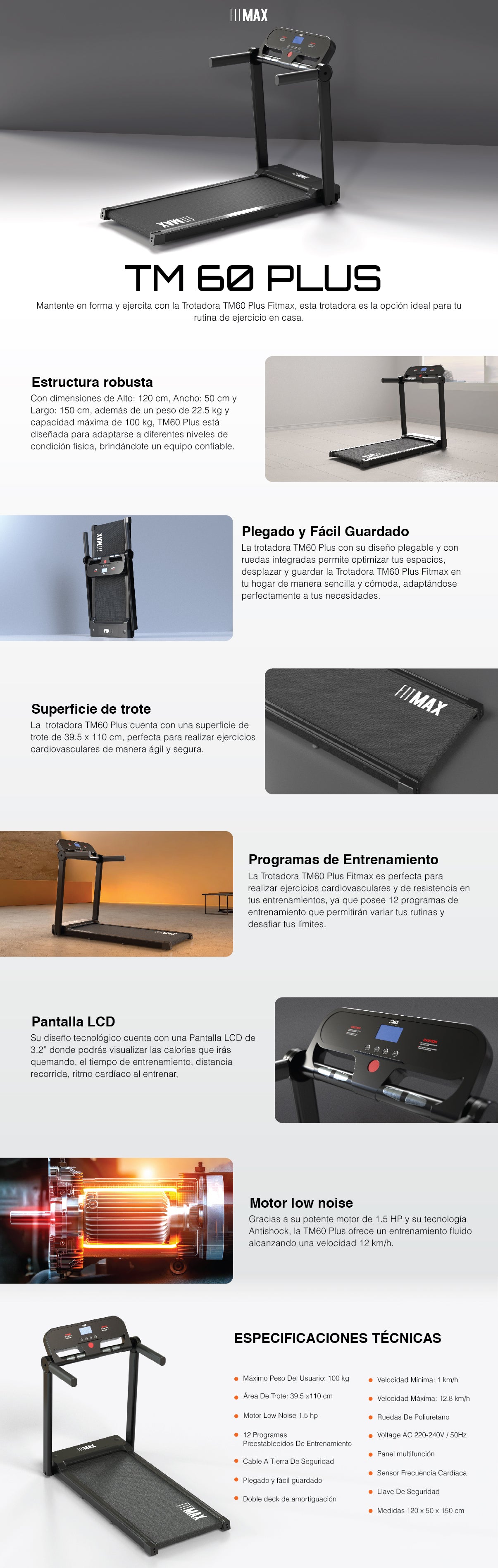 La Trotadora Eléctrica TM60 Plus combina potencia, ergonomía y practicidad, siendo la aliada perfecta para alcanzar tus objetivos fitness desde la comodidad de tu casa.