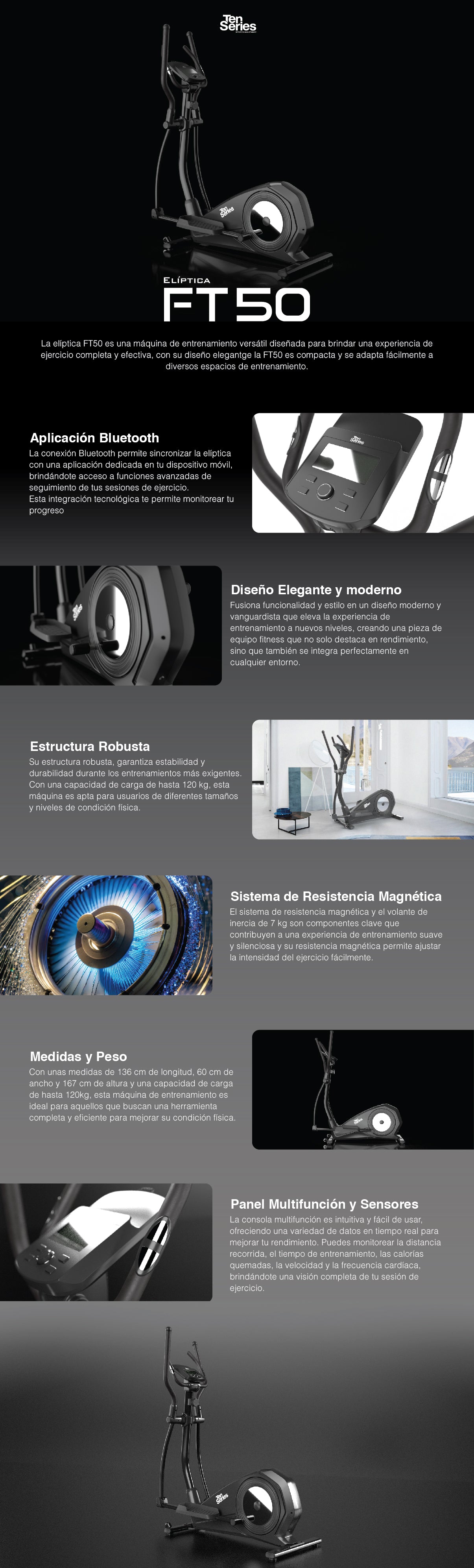 Ya sea que estés buscando mejorar tu resistencia cardiovascular, quemar calorías o tonificar tus músculos, la Elíptica Ten Series FT50 ofrece una experiencia de ejercicio completa y eficaz para alcanzar tus metas de fitness.