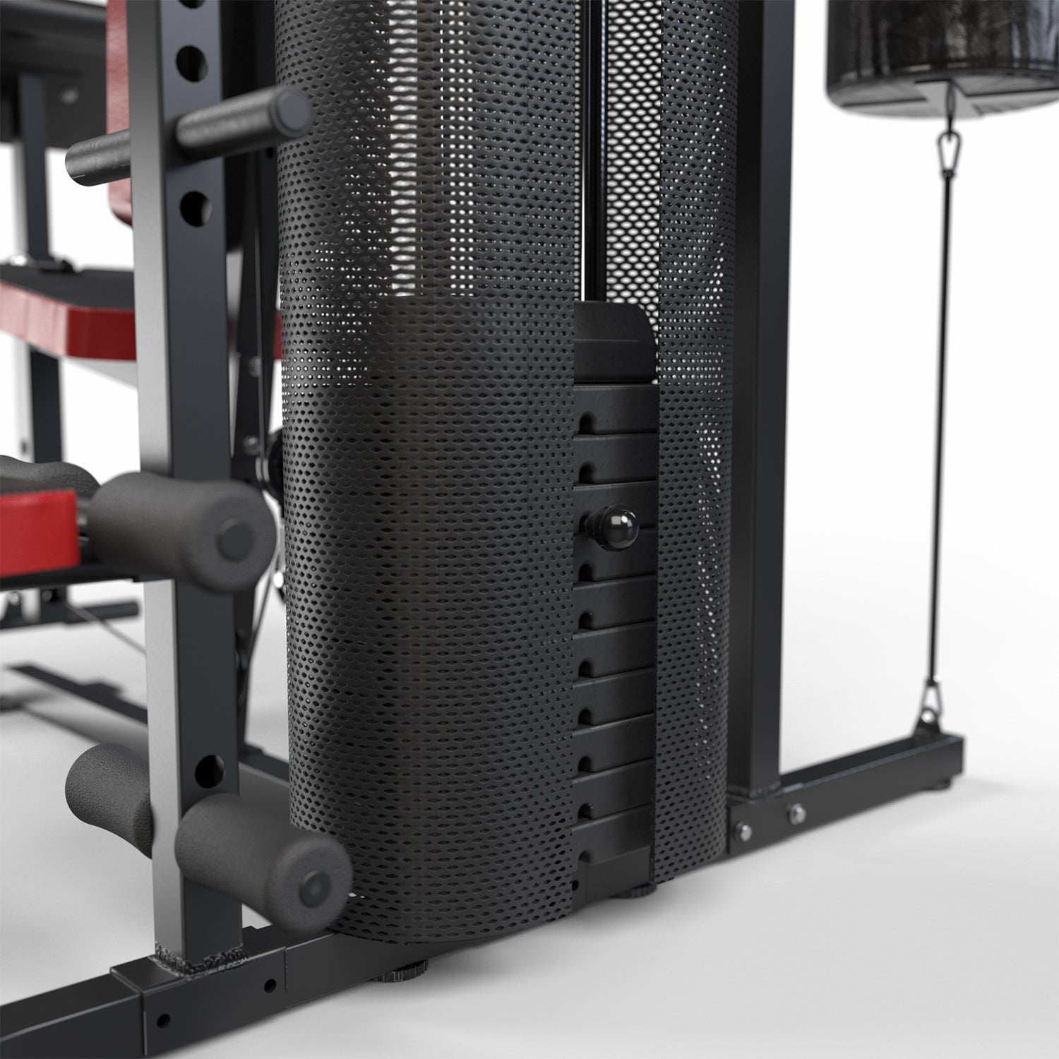 Fabricado con estructura de acero reforzado y barra de pesas integrada de hasta 120 kg, cuenta con múltiples estaciones para trabajar tren superior, tren inferior y core, junto a un módulo de boxeo perfecto para sesiones de entrenamiento funcional y alta intensidad.