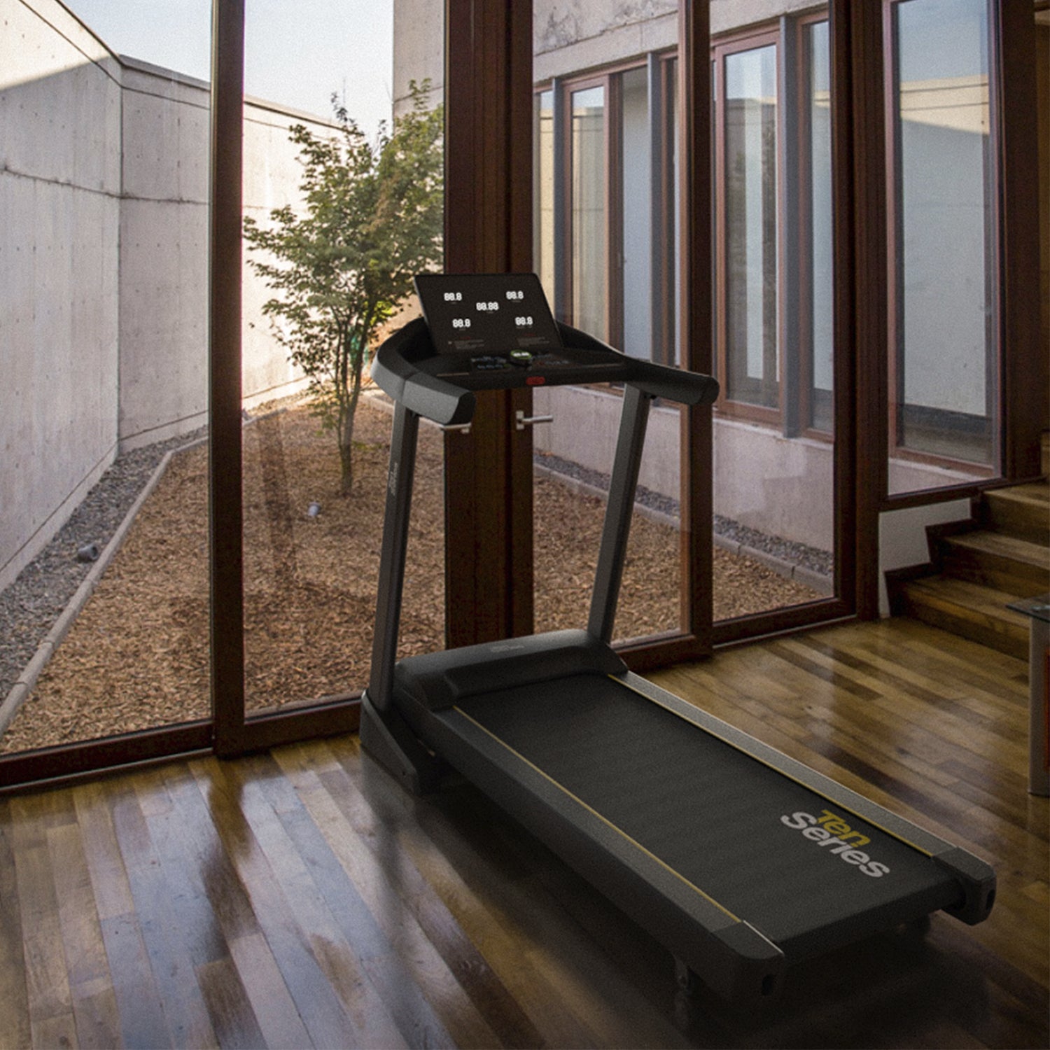 Su sistema de plegado hidráulico ahorra espacio, mientras que el sistema Antishock protege tus articulaciones durante cada paso. Con una superficie de trote de 135 cm x 48 cm, la Trotadora Black A9 de Ten Series proporciona un amplio espacio para correr cómodamente. Sus dimensiones son: Alto: 132 cm, Ancho: 76 cm, Largo: 164 cm y tiene un peso de 65 kg.