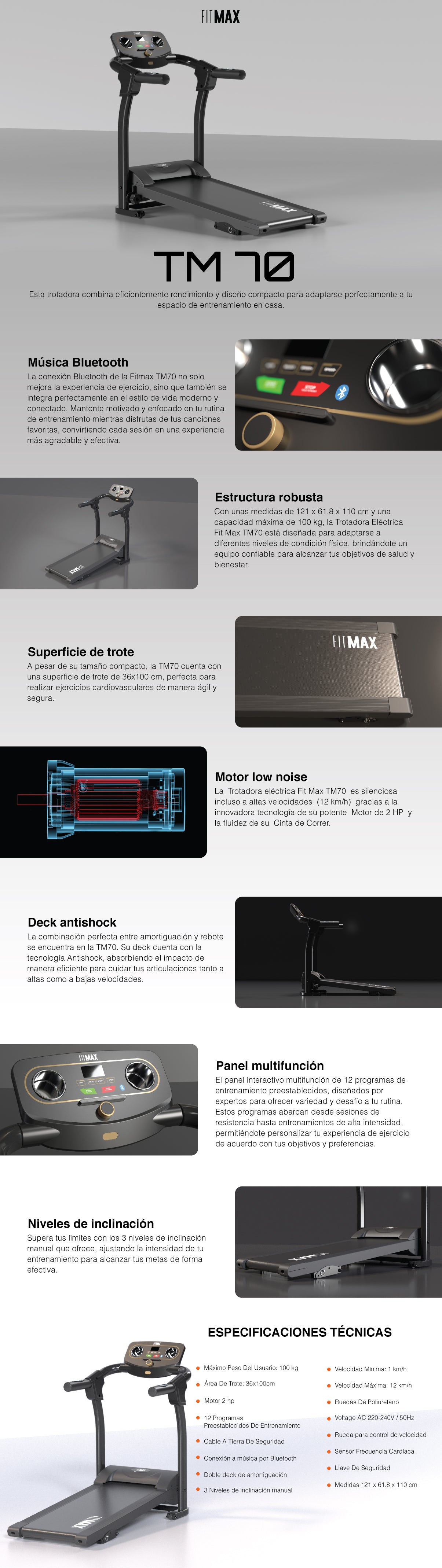 La Trotadora Eléctrica TM70 Ten Series es la combinación perfecta de potencia, comodidad y practicidad para tus entrenamientos en casa. Con un motor de 2 HP y una velocidad máxima de 12 km/h, esta cinta de correr eléctrica ofrece el rendimiento ideal para ejercicios cardiovasculares, pérdida de peso y mejora de la resistencia física.
